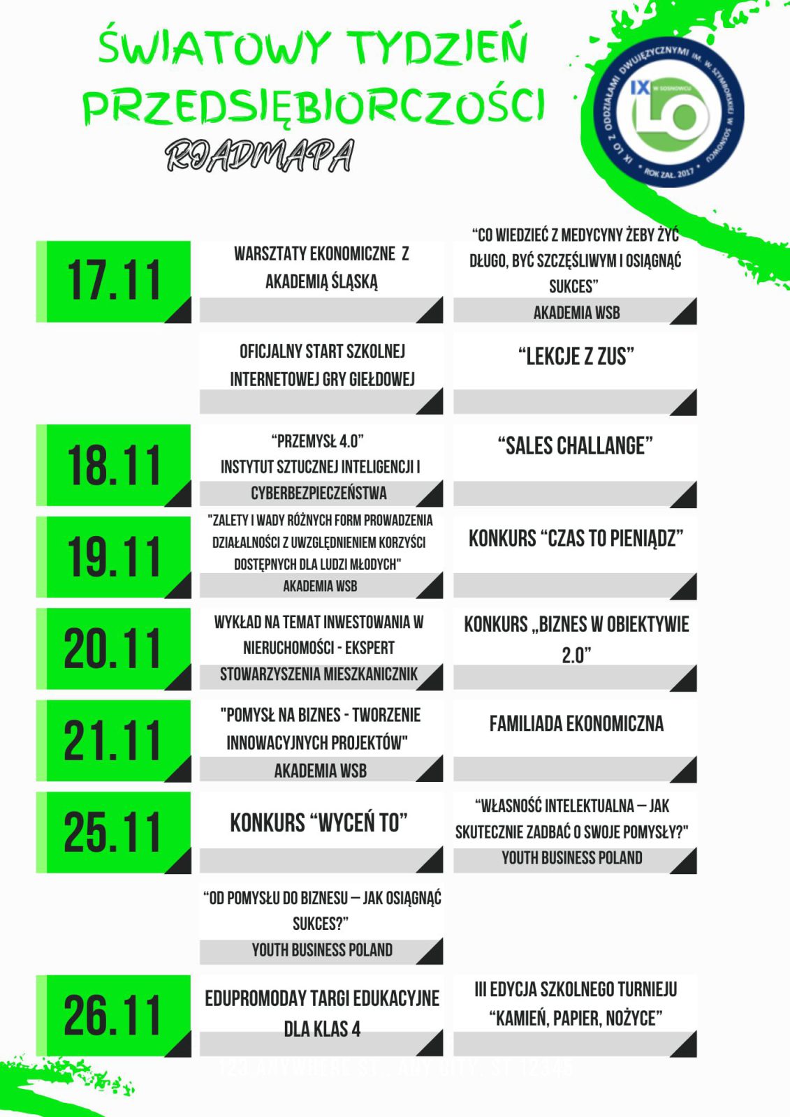 Przez cały tydzień czekają nas inspirujące działania, które pokażą, że przedsiębiorczość to nie tylko prowadzenie firmy, ale też kreatywność, współpraca, umiejętność rozwiązywania problemów i odwaga do działania.