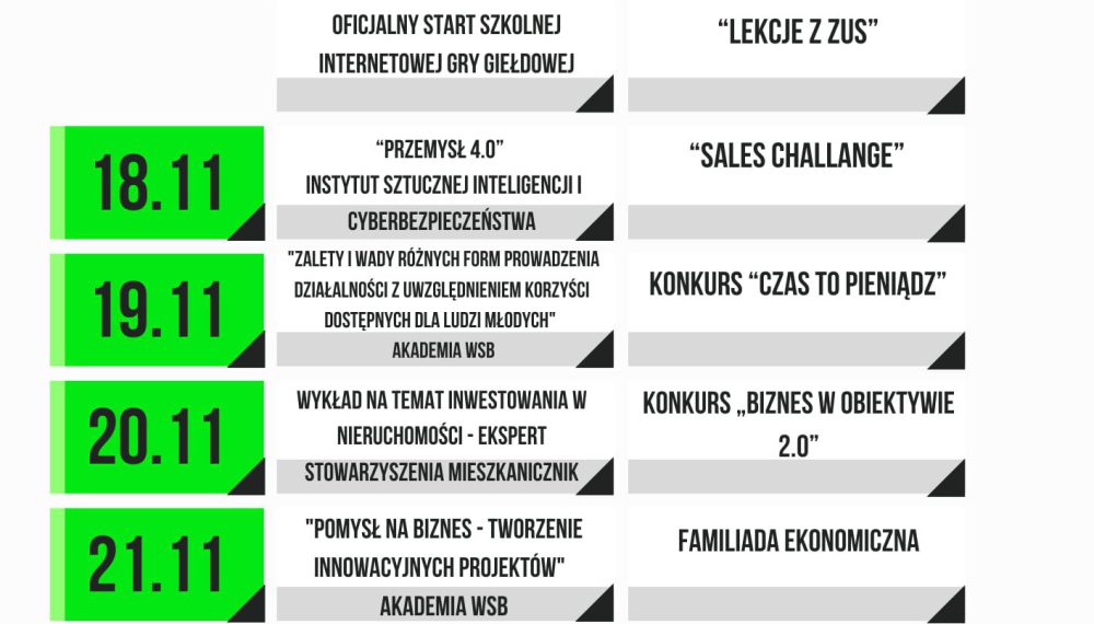 Przez cały tydzień czekają nas inspirujące działania, które pokażą, że przedsiębiorczość to nie tylko prowadzenie firmy, ale też kreatywność, współpraca, umiejętność rozwiązywania problemów i odwaga do działania.