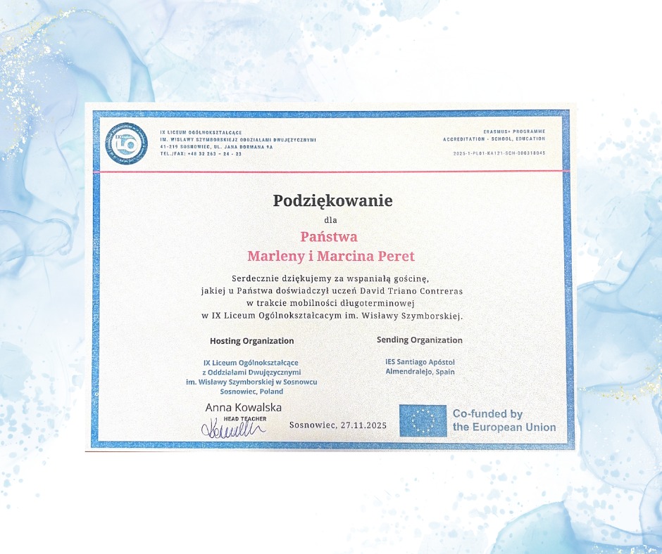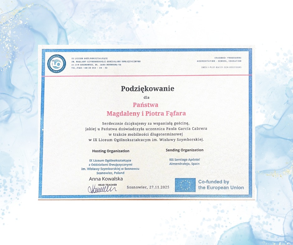 Dziękujemy za gościnność i codzienną troskę, dzięki której uczniowie z wymiany długoterminowej z Hiszpanii mogli poczuć się tutaj jak u siebie. Wasza życzliwość i otwartość były kluczowe dla sukcesu projektu Erasmus+. Jesteśmy ogromnie wdzięczni!