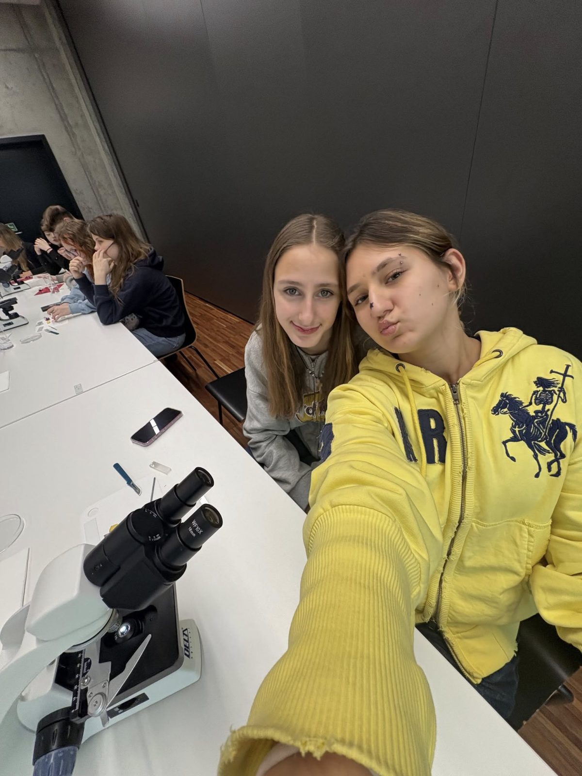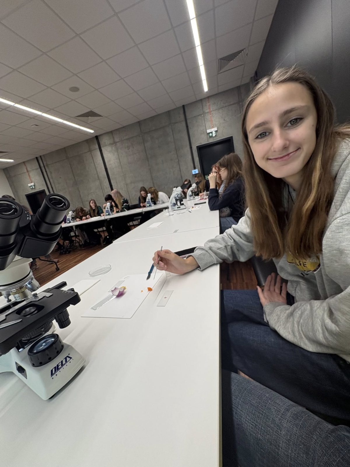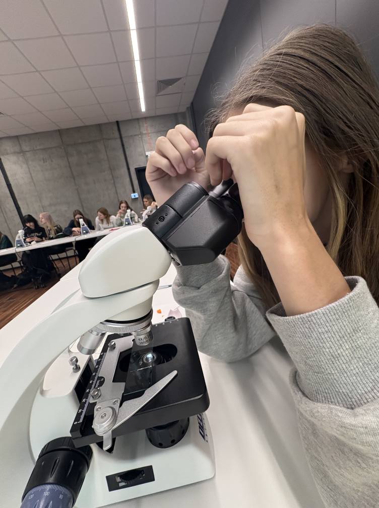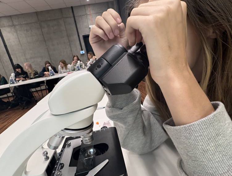 Druga część zajęć poświęcona była mikroskopowaniu. Uczniowie przypomnieli sobie kluczowe zasady pracy z mikroskopem, a następnie samodzielnie wykonywali preparaty, ćwicząc swoje umiejętności laboratoryjne.